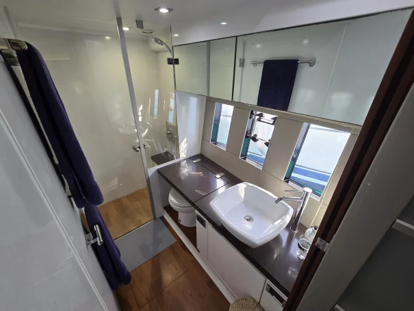 Anphica features 3 luxury cabins for up to 6 guests. The master cabin is forward with a centre king-size bed and en-suite facilities. Two further cabins have twin side-by-side beds with the option of converting into doubles. The starboard guest cabin offers en-suite facilities which can also be accessed from the lobby as a day head. A further single crew cabin or for storage is aft.