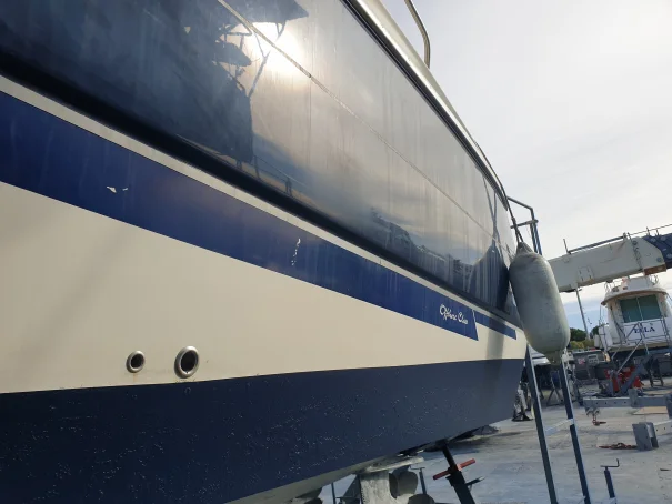 Outdoor spaces continue the Italian styling with plenty of sun pads and a dining/seating area in the cockpit with its own outdoor fridge, sink and barbeque for alfresco dining. The decks are maintenance-free with new synthetic teak throughout the cockpit and swim platform. The hull is finished in a striking painted blue, a smart upgrade over traditional blue gelcoat, which is known to fade over time, ensuring a vibrant and long-lasting appearance.