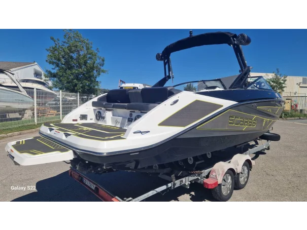 Turn heads on the water with this sleek and powerful Scarab 255 Wake Edition, featuring an Impulse Black and Phantom Grey hull complemented by a luxurious Eclipse Black interior. Powered by twin Rotax 230hp jet drive engines with just 32 hours of use, this boat delivers exhilarating performance and precision handling for wakeboarding, waterskiing, or simply cruising in style.