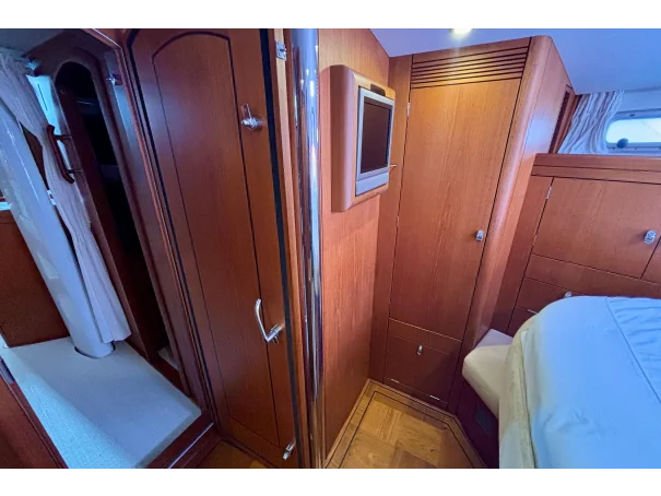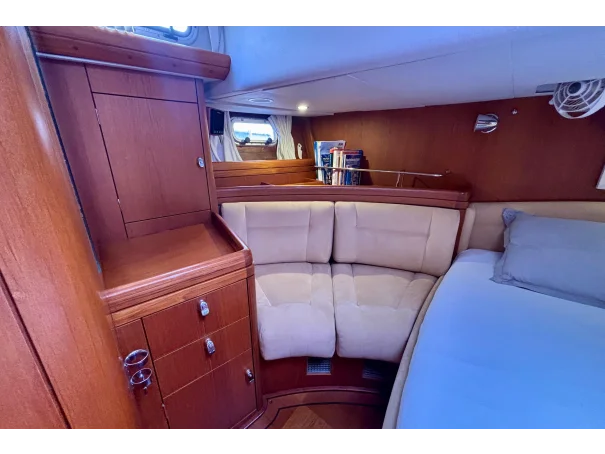 Cabina de proa: equipada con una gran litera doble, escotillas superiores que aportan luz natural y ventilación, además de amplios espacios de almacenamiento en cajones y armarios roperos.