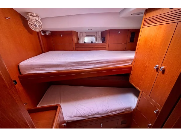 Cabina de babor: dispone de literas gemelas, ideales para tripulación o invitados, con luces de lectura individuales y espacio de estiba.