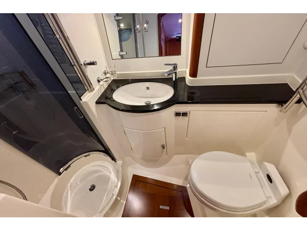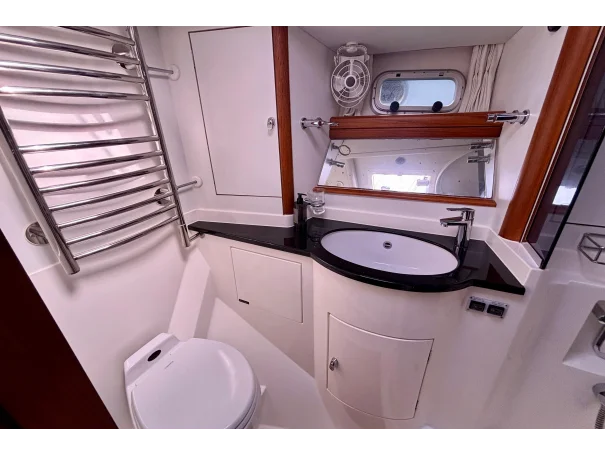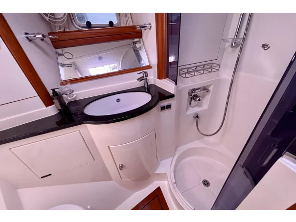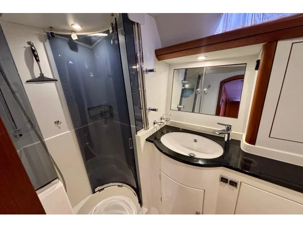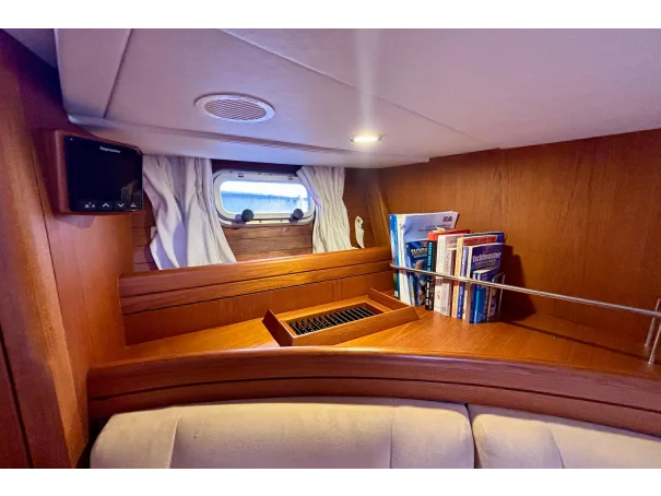 Esta embarcación ofrece un interior amplio y meticulosamente diseñado, con un lujoso acabado en teca. La distribución aprovecha el espacio de manera excelente, garantizando privacidad y confort: