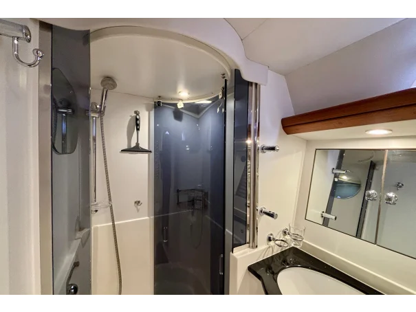 Aft Cabin: A luxurious owner’s suite with a double berth, en-suite washroom with a shower, and abundant storage.