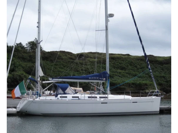 This 2008 Dufour 425 Grand Large is a one owner boat from new. She has been meticulously well maintained and has been laid up ashore every winter. She is powered by a well maintained Volvo 55hp diesel engine with 1733 engine hours and a 2021 saildrive seal. Her layout consists of twin aft cabins, saloon, galley, owners cabin forward and two heads. Her inventory includes, retractable bow thruster, fully battened mainsail with single line reefing, lazy bag, furling genoa, electric windlass, chart plotter, auto-pilot, heating and a lot more. "Elusive" is in excellent condition and viewing is recommended.