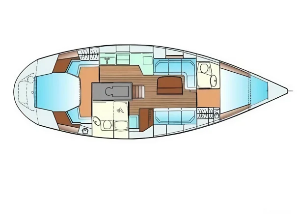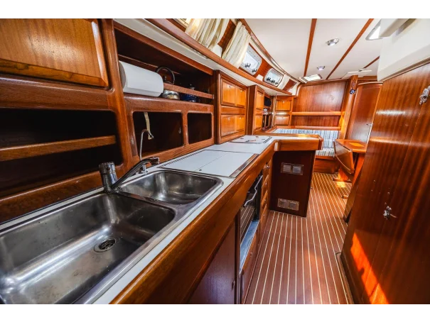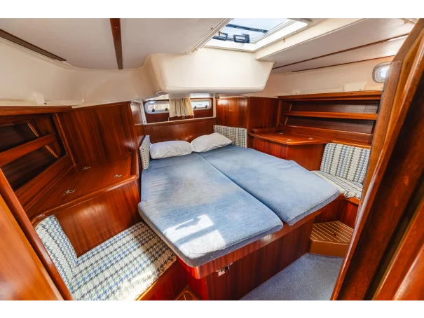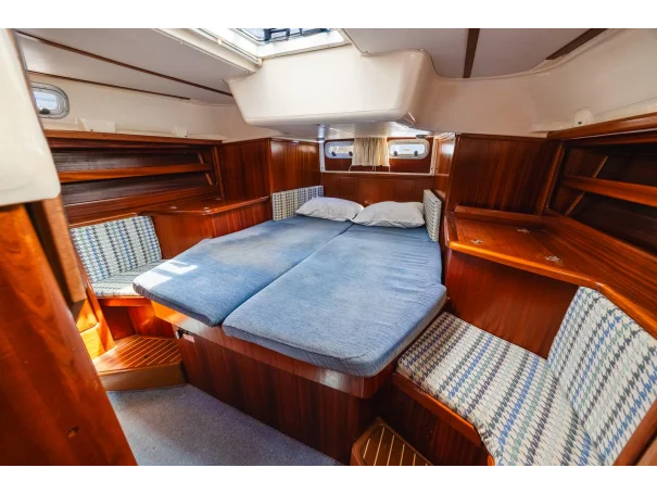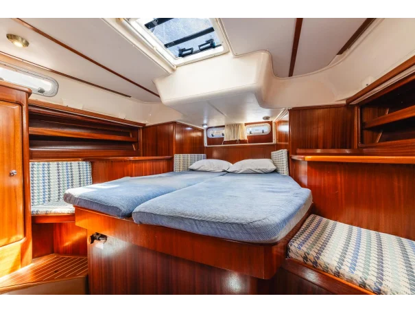 Spacious centre cockpit layout with a large owner’s aft cabin featuring en-suite heads and king-size slat-based mattress. A forward double cabin also includes en-suite access, while the saloon offers two generous single berths.
