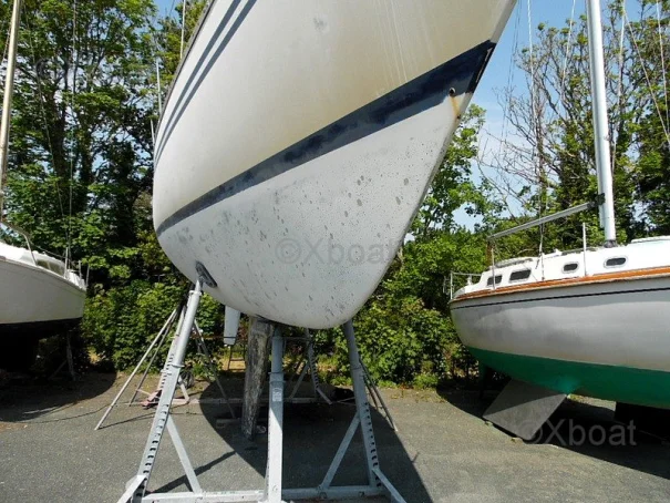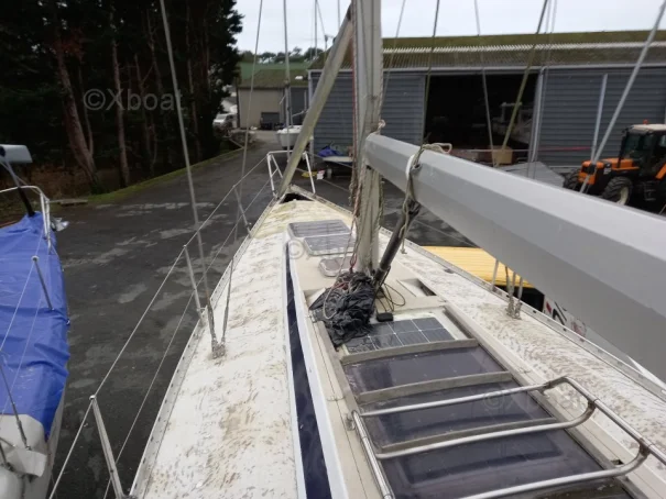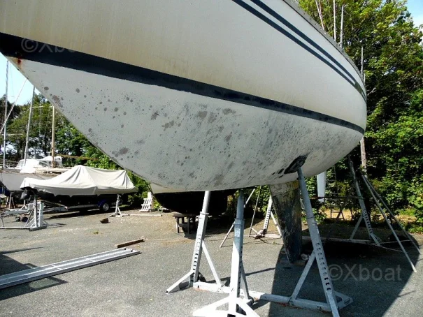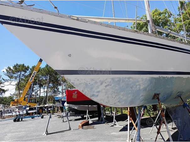 Some work is currently underway: The vessel is currently stored ashore in a shipyard. The hull has been stripped of its antifouling, revealing small surface osmosis blisters that are currently being treated. The deck has been stripped of its teak, sanded, epoxy applied, then the deck has been painted with a non-slip coating and its watertightness checked. All seacocks and valves have been replaced, and the hull has been sanded and repainted. All damaged portlights have been redone, and the interior varnishes are being refurbished.