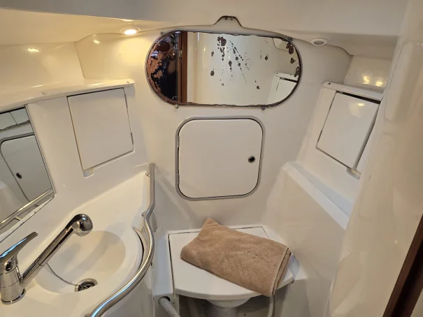 Forward guest cabin: Double berth to Starboard with seat/wardrobe storage to port, with its own WC shower room forward.