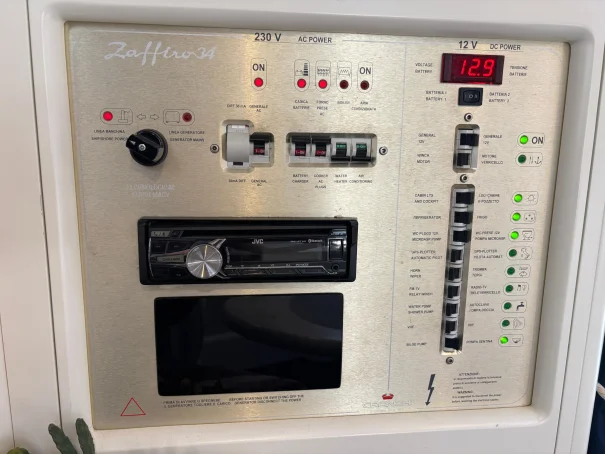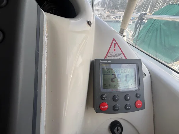 Electrónica: piloto automático Raymarine, reproductor de CD, altavoces en bañera, compás, sonda Raymarine, GPS Raymarine, corredera-velocímetro Raymarine, plotter Raymarine, radar Raymarine, radio, TV, VHF.