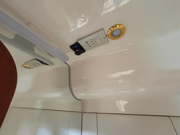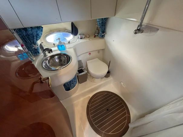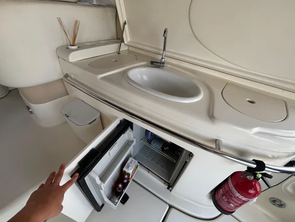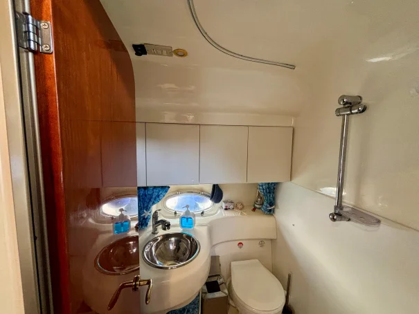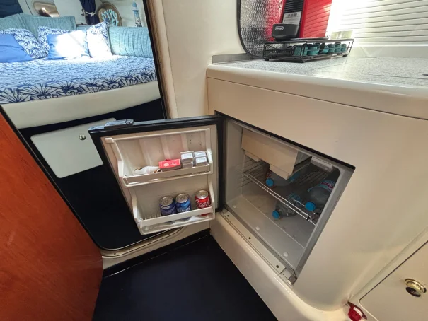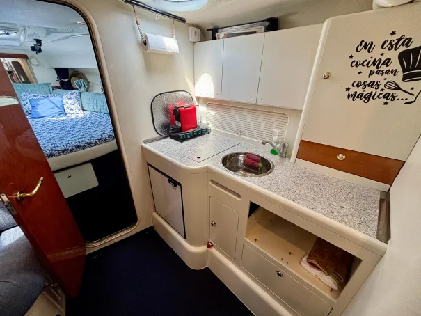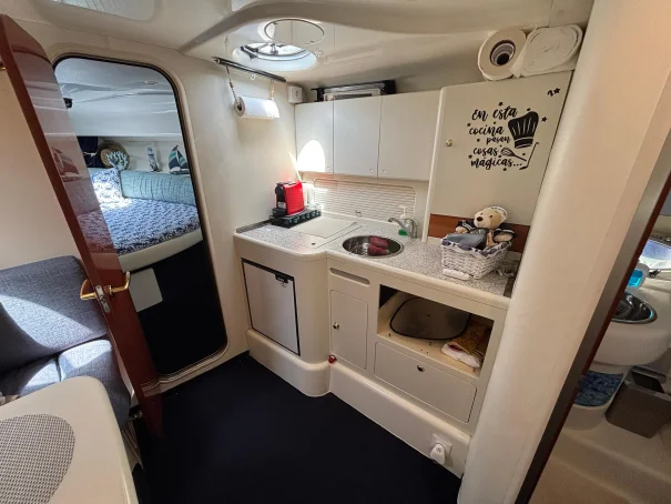 Distribución Interior: El interior cuenta con dos amplias cabinas dobles y un baño completo con inodoro eléctrico y una generosa área de ducha. El salón se convierte en una cama adicional, permitiendo que el barco acomode cómodamente a 6–7 personas para estancias nocturnas.