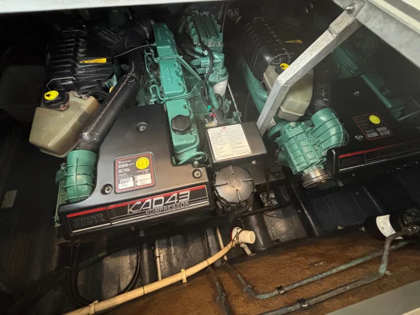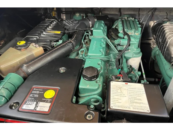 Twin Volvo Penta KAD43P DP-E diesel engines power this Cranchi Zaffiro 34. The engines feature mixed cooling systems (utilising both seawater and freshwater) and six cylinders per engine, delivering reliable, efficient, and smooth performance.