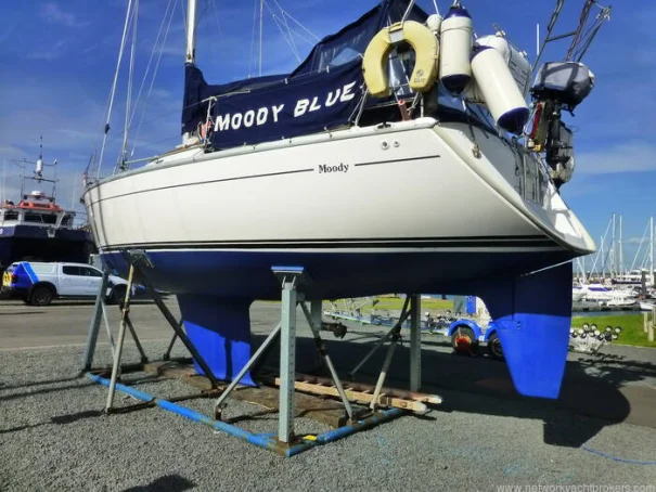The Moody S31 is a comfortable, fast cruising yacht and offers excellent accommodation within 31ft. Forward twin / double berth cabin, light and bright saloon with two settee berths and a spacious double berth aft cabin. This fin keeled Moody S31 has a canopy to fully enclose the cockpit against the elements. The cockpit has tiller steering and the transom seat moves for ease of access to the stern platform. Custom stainless steel arch at the stern supports two solar panels and outboard davit. Volvo Penta MD2020 19hp engine. Sail Drive diaphragm renewed August 2025. Sale includes a Mariner 4hp outboard an inflatable dinghy. 145 Moody S31s were built between 1994 and 1998. Accommodation : Forward cabin with V berths that can be converted to a double berth with the infill cushion. Under berth storage, hanging lockers and opening roof hatch. Door leading through to the saloon with port and starboard bench settees and central drop leaf dining table with bottle storage. Opening roof hatch, curtains throughout and lee cloths at settee berths.. Aft facing chart table to starboard and aft of this, door to the heads compartment. L shaped galley to port and aft, door to the aft cabin. This cabin has a double berth, seat, hanging locker, storage, under berth storage, portlight, opening hatch to cockpit, engine access cover. Central companionway with engine access below. Galley Two ring gas stove with grill and oven Fridge Stainless steel sink Hot and cold water system Storage Opening portlight
