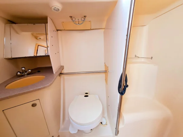 The U-shaped galley is well equipped with a two-burner hob, oven, grill, galley sink, cool box, fridge (note: new door seal required), and a freezer. Pressurised hot and cold water is supplied via an immersion heater and calorifier system. Entertainment includes a stereo system, TV with aerial, DVD player and satellite TV receiver. Air conditioning (sea water cooled) is also fitted.