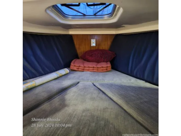 Forward cabin with V berths with an infill to convert to a double berth. Opening hatch and storage. Jabsco sea toilet to