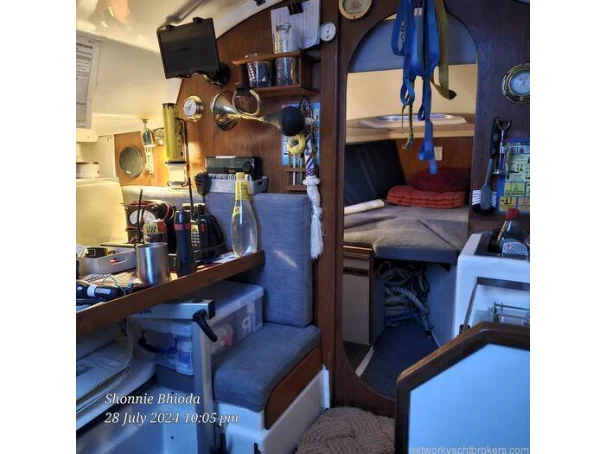 port and hanging locker to starboard. Through to saloon with L shaped settee to starboard, galley and small bench settee to port. Quarter berths to port and starboard. Removable table. Access to engine under companionway steps.