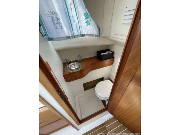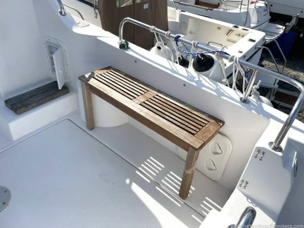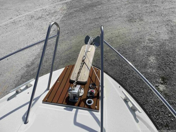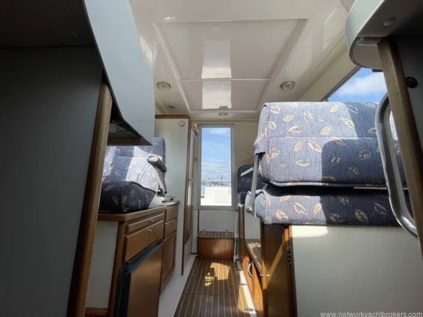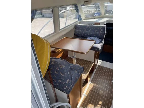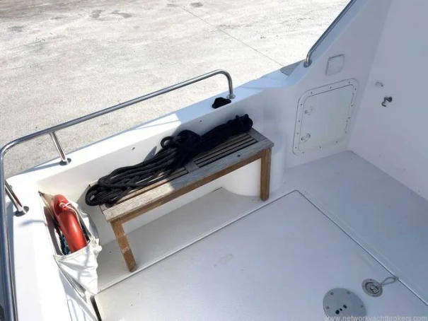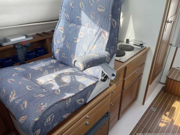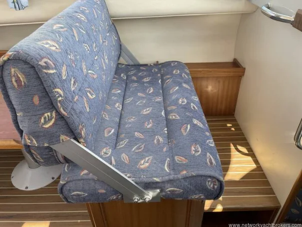 Loads of storage space throughout. Pressurised hot and cold water (via engine and 220V), "Mikuni" hot air heating. Inventory : On Deck Good access forward helped by extended stainless steel pulpit and grabrails Anchor locker Anchor with chain and warp Mooring lines and fenders 6 x Mooring cleats Outside steering station to starboard with bow and stern thruster control units Self draining cockpit Large lazarette (under cockpit sole) with access to the engine and electrics etc. Grab Rails throughout Shore-power cable locker Large swim/boarding platform with stainless steel swim ladder and grab handles, Hot shower in the cockpit