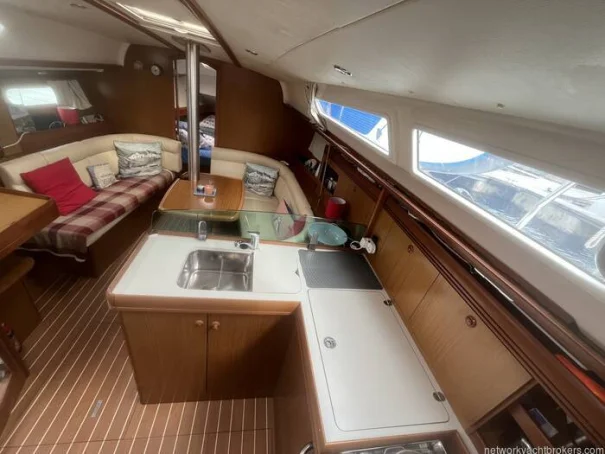 The 'L' shaped galley is to starboard and at the after end of the saloon Delux two ring gas cooker and oven Fridge with freezer compartment Stainless steel sinks with mixer tap Storage spaces Pressurised hot and cold fresh water via a mixer tap Hot water via a calorifier and immersion heater