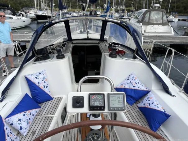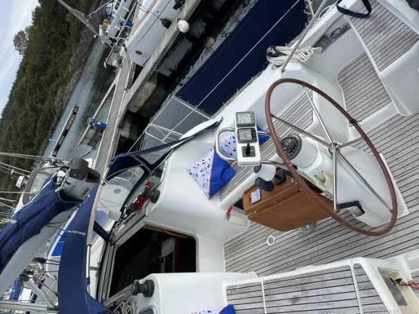 Wheel steering Access to stern bathing platform Teak deck and seating in cockpit Cockpit storage lockers Custom built cockpit table Full cockpit enclosure