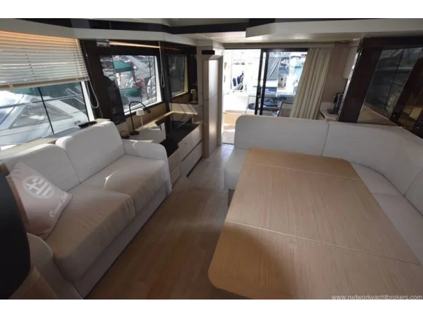 Open-plan salon with full-height windows and sliding glass partition to galley
