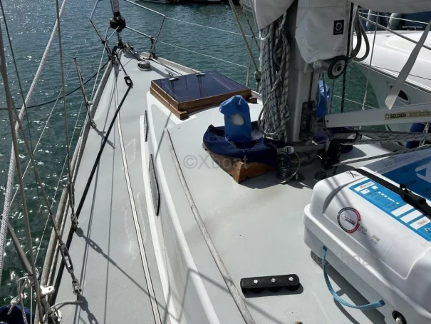 The boat is equipped with a Simrad navigation center, a log, a speedometer, a depth sounder, a weather vane, and an anemometer, all in working order. There are interior and exterior repeaters, a Garmin radar, a Raymarine ST4000 autopilot, an AIS transmitter/receiver, a VHF, and a radio-CD.