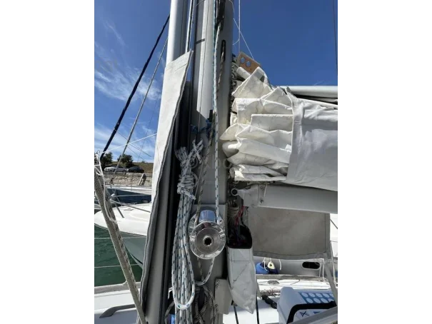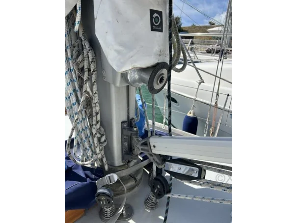 The rigging is Selden brand. The winches are Hutton brand for the self-tailing and Barlow or Lewmar for the others. The boat has a dorade box for ventilation. The Sparcraft mast dates from 2002, and the standing rigging was renewed in 2023. There is a Selden Furlex genoa furler, a removable stay with pelican, and rigid Selden halyards. The storage of the boom is along the mast.