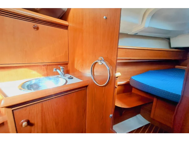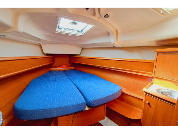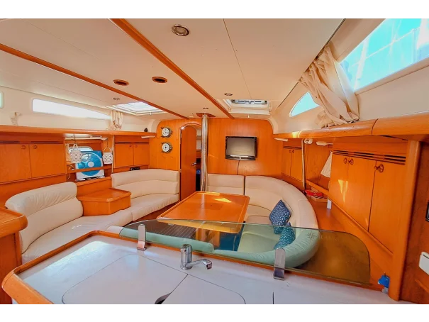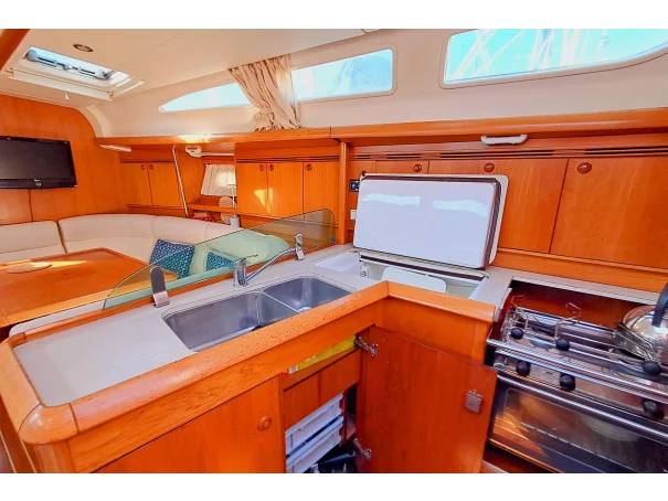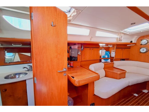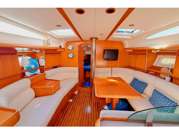 The Jeanneau Sun Odyssey 40.3 features a bright, spacious interior with excellent headroom, finished in attractive wood joinery. The layout is practical for both family cruising and extended stays onboard.