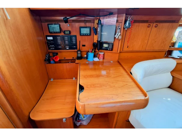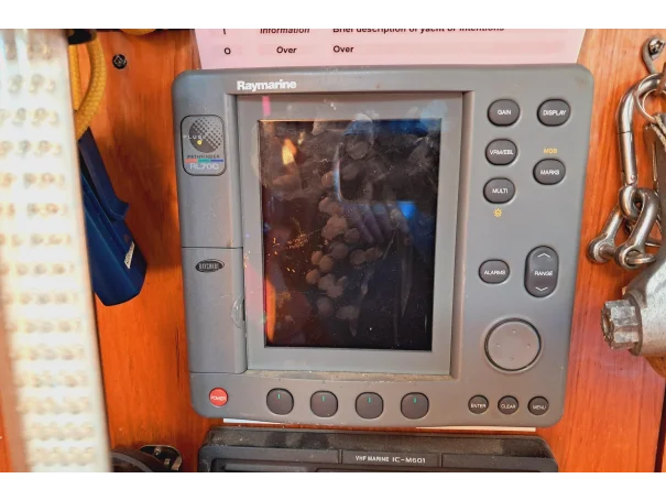 Navigation equipment includes a compass, Raymarine instruments covering speed/log, depth, wind, autopilot and chart plotter. Communication is via an Icom VHF radio. A barometer and clock are also fitted.