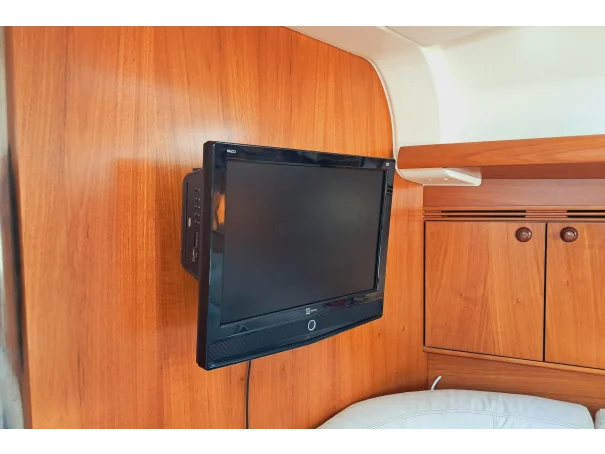 The yacht is equipped with a 12V DC domestic system. Batteries include three 100Ah units from 2023 and one 100Ah unit from 2024. Shore power is fitted with a Christec battery charger. Two solar panels of 80w and 100w are mounted on a stainless steel arch.