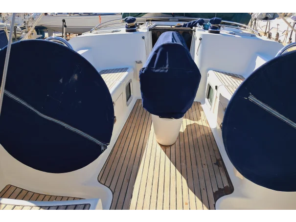 The deck layout features twin wheel steering and a large folding cockpit table. A walk-through transom with swim platform and ladder enhances access to the water. Ground tackle includes a 15kg Manson Supreme anchor on 60m of 10mm chain, plus a kedge anchor, all operated by an electric windlass. The yacht carries primary self-tailing winches as well as secondary winches. A sprayhood, bimini and cockpit dodgers provide shelter. Additional features include a set of fenders, a stainless steel arch with solar panels, and a SUP