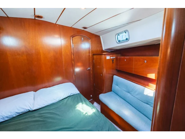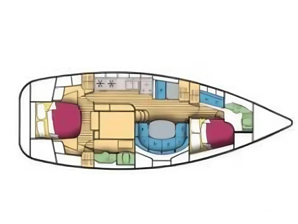 The Oceanis 40 CC’s interior layout features a forward guest cabin with adjacent head, a central saloon with U-shaped seating and nav station, and an aft full-beam owner’s cabin with ensuite. The centre cockpit design enables excellent cabin height and privacy between living spaces, making it ideal for two couples or long-term liveaboard comfort.