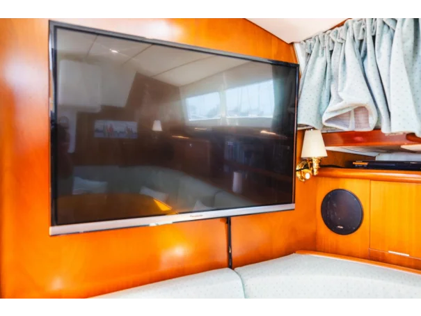 The galley includes a hob, oven, grill, double sink, cool box, refrigerator, and pressurised hot and cold water system. Additional comforts include a TV, DVD player, stereo system, and ample ventilation throughout. A microwave is also fitted. Upholstery, curtains, and wood flooring present the interior in warm and serviceable condition.