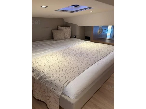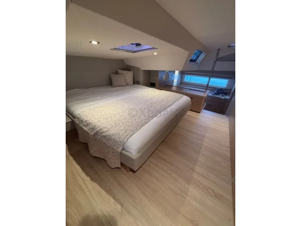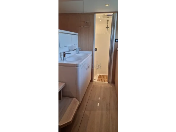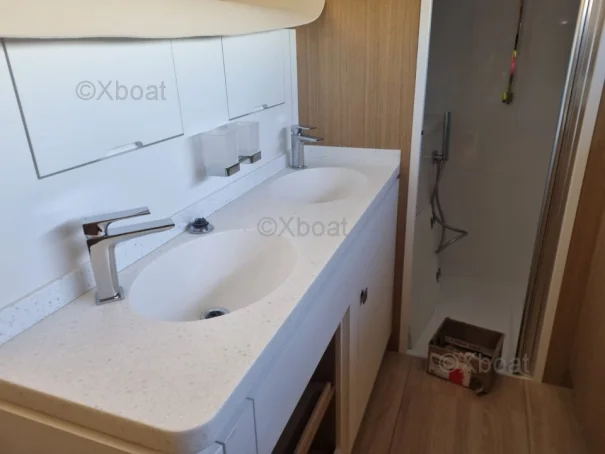 This PRIVILEGE SIGNATURE 510 offers a top configuration: a spacious owner's cabin in the center, spanning the full width of the catamaran, with a private passageway, an exclusive bathroom on the starboard side, and a dressing room with a vanity on the port side.