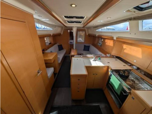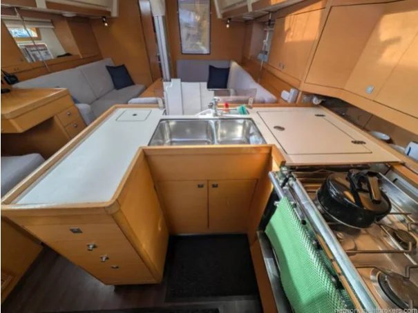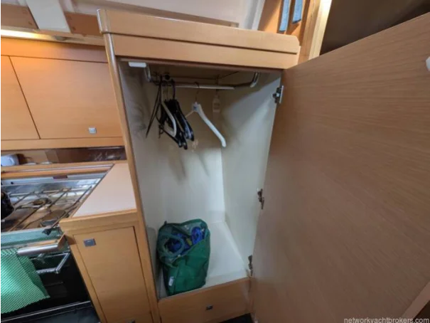 Hanging locker aft of worktop outboard, drying locker with countertop above.