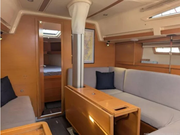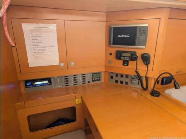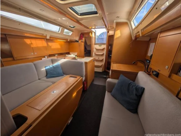 Bookshelf centrally outboard of settee back rests with storage lockers forward and aft to port and starboard