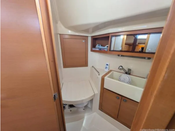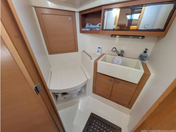 Manual marine toilet located aft, moulded GRP seat to fit over toilet when not in use