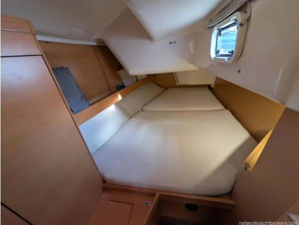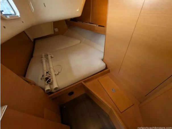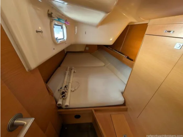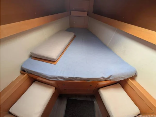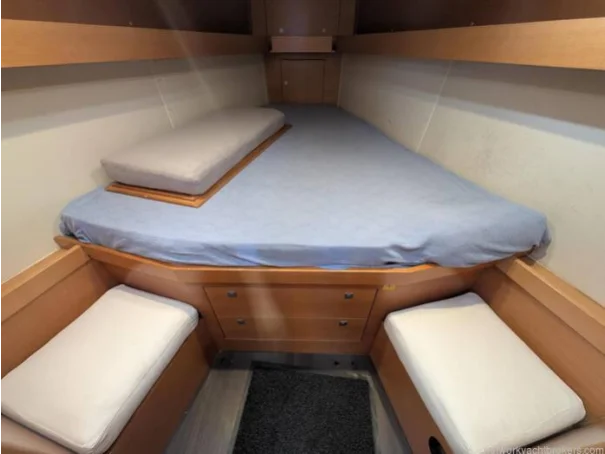 Double bunk extending aft with shelve running length of bunk outboard above bunk level