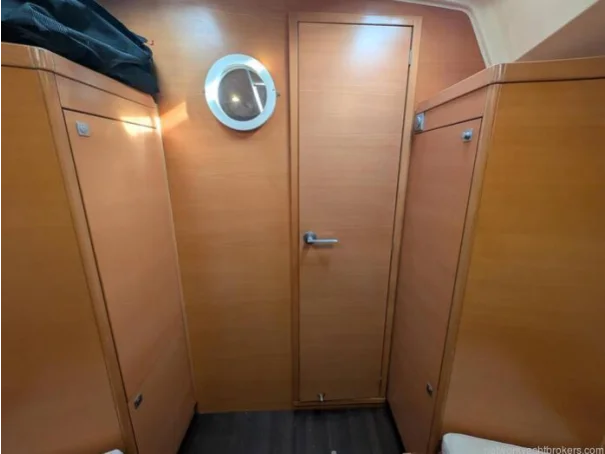 Two lockers aft of seat to upper hanging locker space and lower shelved section