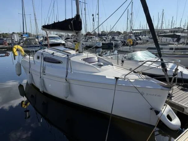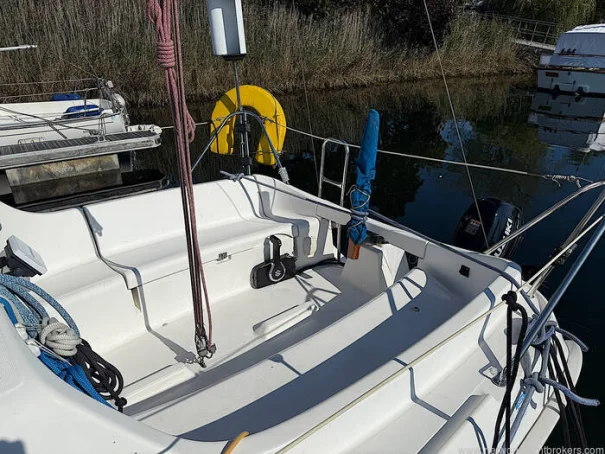 This fin keeled, outboard motor version of the Sun Odyssey 24.2 is extremely spacious for its length. With a genuine double berth aft, two forward berths, a practical galley layout with twin hob cooker, and a toilet equipped washroom (sink inoperative). A spacious cockpit, with free access to the stern swim platform and ladder.