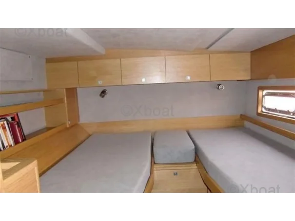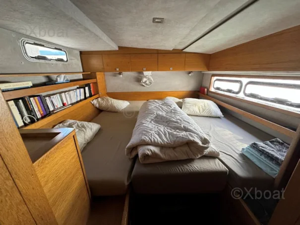 LOUARN is a 4-cabin version, with two aft cabins with separate beds that can be converted, and two forward cabins, each with a bathroom. The saloon is bright, treated in light wood, with a U-shaped kitchen open to the cockpit, which is very appreciated and very well equipped. It faces the real chart table, oriented towards the front, and an L-shaped saloon with its foldable and telescopic table.
