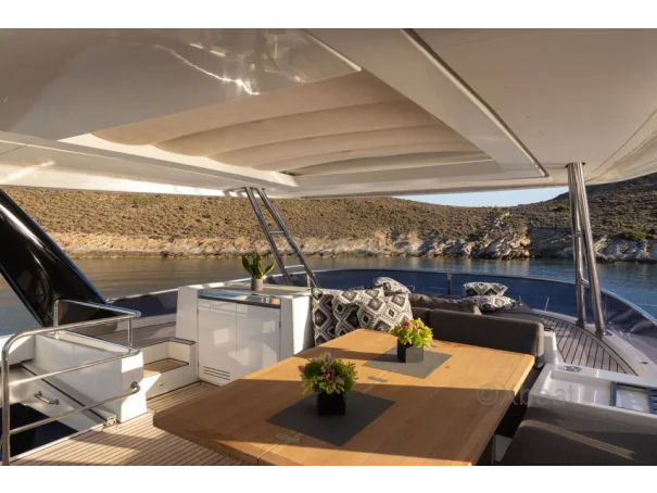 The foredeck with its 2 large sunbathing areas, teak latticed decking, tender lift, fully enclosed flybridge, true areas dedicated to relaxation and leisure. In terms of equipment, it has everything: air conditioning, generator, desalinator, large fridges,...