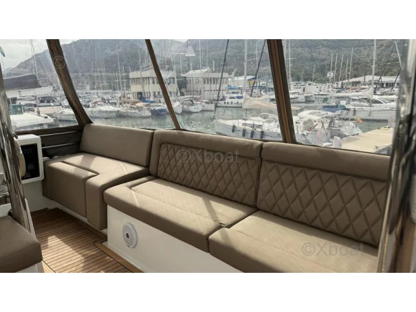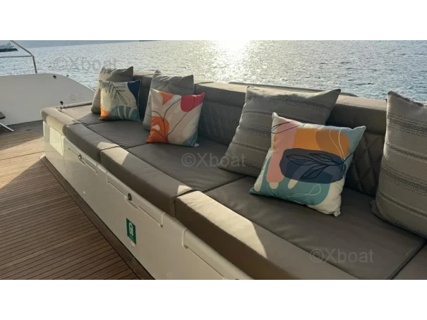 Since its acquisition in early 2023, the owner has undergone a refined cosmetic refit with leather sofas, a rather cozy outdoor upholstery, and the equipment is quite generous: wine cellar, hydraulic gangway, tenderlift, air conditioning, large generator, and 2 Volvo 300 hp engines for comfortable performance.