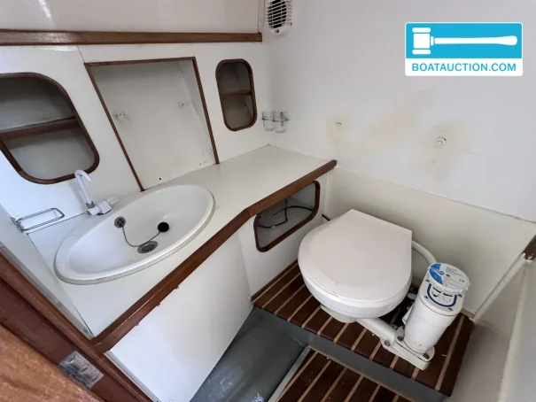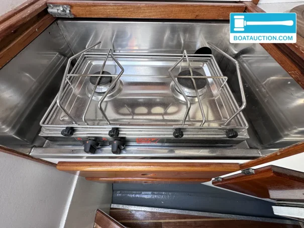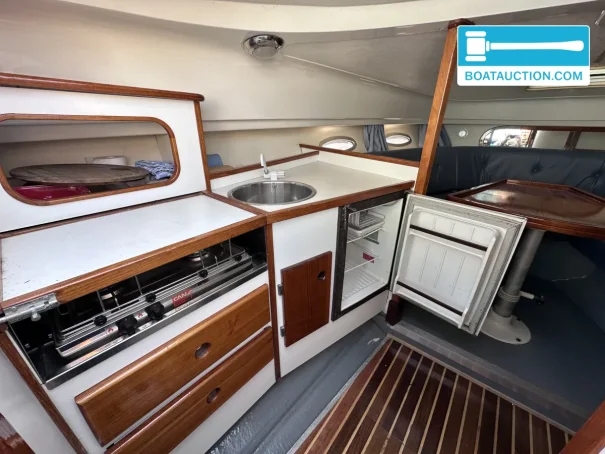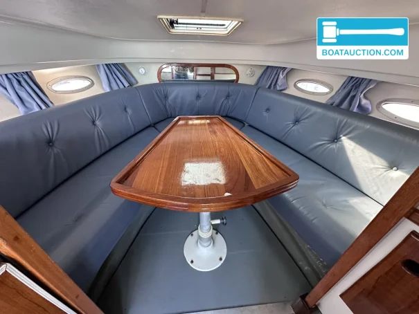 Inside the Scand Dynamic 9200, there is a small salon with a classic and warm appearance. The headroom is 160 cm. There are two fixed berths, making the boat suitable for overnight stays for two people. The upholstery is in a blue color. The kitchen is equipped with a two-burner gas stove and a refrigerator. For sanitation, there is a manual toilet. The water system operates on a pressure system.