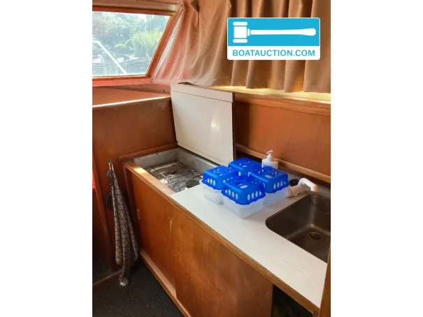 The cruising speed of the boat is approximately 15 km/h, with a maximum speed of about 24 km/h. Various measuring instruments are present on board, including a fuel tank gauge, oil pressure gauge, temperature gauge, and tachometer. The electrical installation consists of two batteries, a battery charger, alternator, and voltmeter. The system operates on 12v.