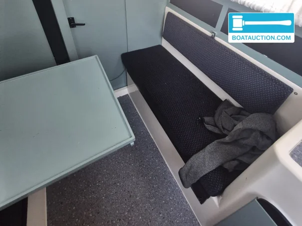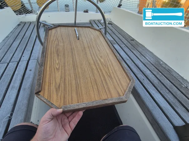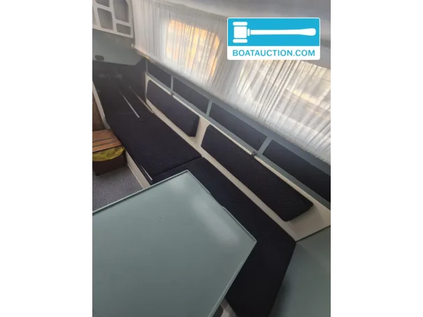 The boat features a Navman navigation system, whose screen needs replacement. On deck, the boat is equipped with a manual anchor winch, an anchor with chain, bimini, outdoor cushions, fenders, lines, a swim ladder, and a guardrail. No dinghy is included. For safety, there is a lifebuoy and a manual bilge pump.