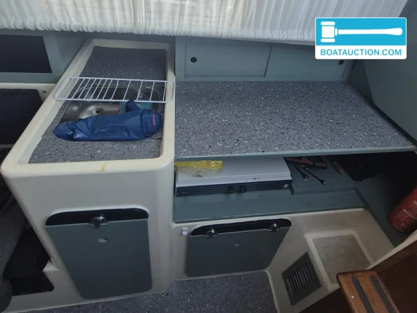Inside, the Westerly Centaur offers a standing height of 1.80 meters, contributing to onboard comfort. The boat features a sleeping cabin in the bow and provides a total of four berths: two fixed and two additional sleeping places. The salon is equipped with a dining area, mattresses, a stove, and a refrigerator. The kitchen is equipped with basic kitchenware such as cups, plates, and bowls. The manually operated toilet is connected to a closed system and does not discharge directly into open water.