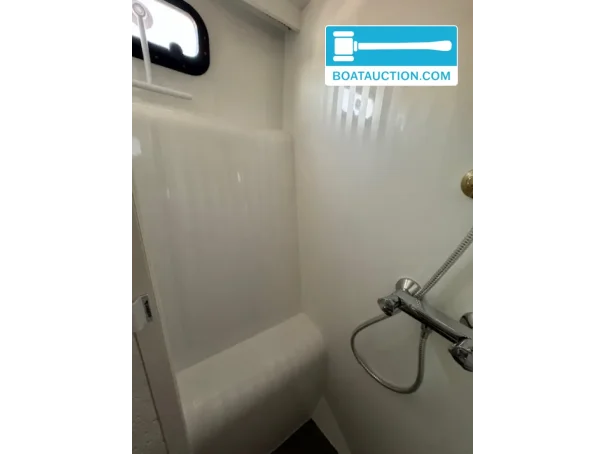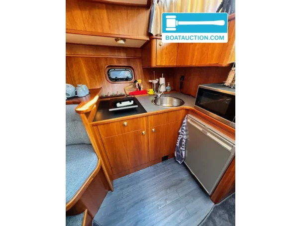 The Vri-Jon Contessa 37E features a practical layout with two fixed berths and two additional berths, making the ship suitable for up to four people. The interior space includes a dining area, mattresses, a shower, and an electric toilet. The toilet discharge is directly connected to open water. The kitchen is equipped with a stove, refrigerator, freezer, microwave, and hot water supply.