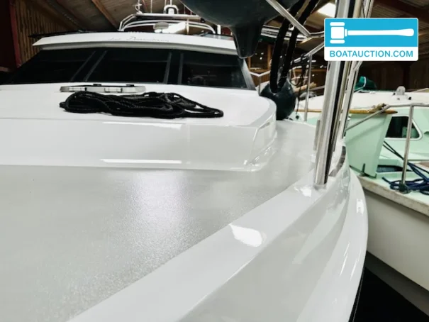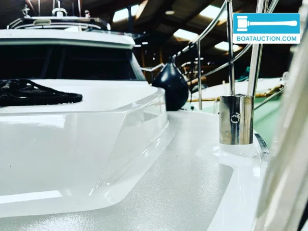 In terms of navigation, the ship is equipped with a depth sounder. For anchoring, there is a manually operated anchor winch with chain. The exterior equipment includes a teak deck, bimini, cockpit tent, tarpaulins, swim ladder, swim platform, pulpit and stern seats, and a guardrail. A dinghy or trailer is not included.