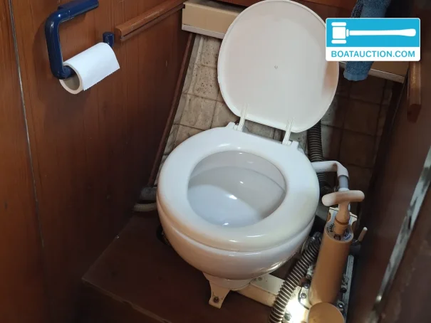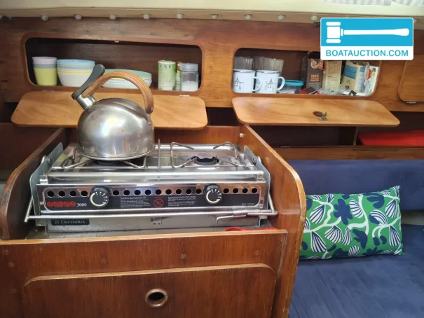 The interior of the boat is finished in wood with copper details, creating a warm and classic appearance. The cabin is equipped with a dining area, mattresses, and a spirit stove. There are five fixed berths, including a berth on the foredeck with a view of the starry sky. The boat has a manual toilet with direct discharge to open water. The water tank has a capacity of 60 liters, although it has not been used by the current owner.