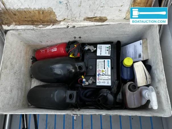 The boat features a 12V electrical installation with a recently installed battery. A battery charger is available for recharging the battery from shore power.