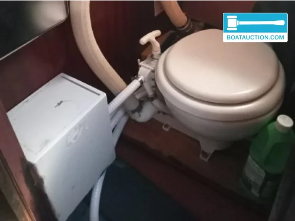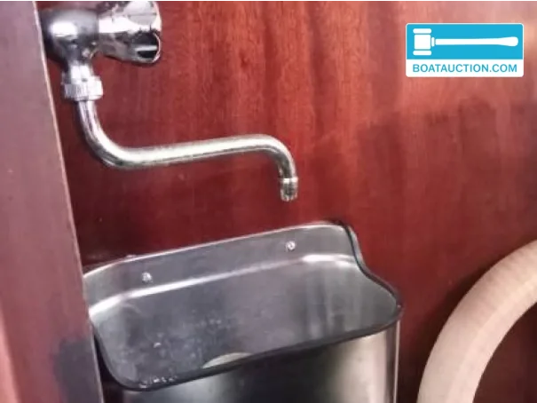 On deck, the boat is equipped with a swim ladder, pulpit and pushpit seats, a guardrail, and a self-draining cockpit. There are two anchors present, secured with chain and line. The bilge pump is manually operated.Â