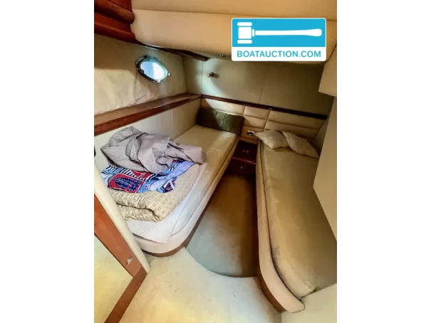 The interior upholstery shows signs of wear or detachment in some areas. Additionally, there is an electrically operated window on the port side that is currently not functioning. The instrument panel on the flybridge shows signs of use, and the navigation system is outdated and defective. These elements may require attention from a future owner.